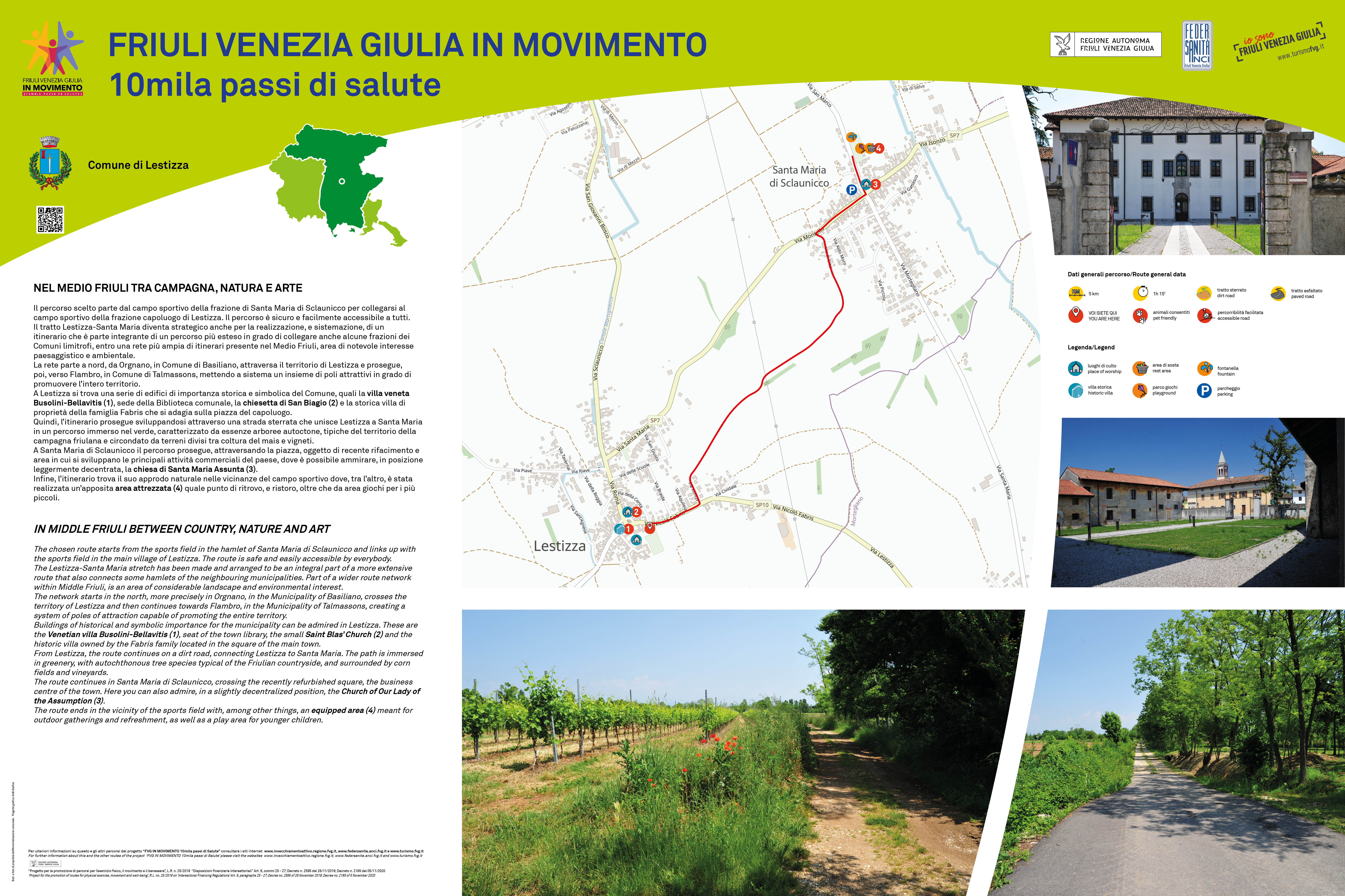 Il percorso, lungo circa 5 km., collega il campo sportivo di Lestizza con quello di Santa Maria di Sclaunicco, due aree importanti per praticare l’attività fisica e motoria, a tutte le età, da soli, o in compagnia, finalità prioritarie del progetto e del “Piano regionale della Prevenzione 2021- 2025” - “Comunità attive”. Esso attraversa luoghi simbolo, tra cui la villa veneta Busolini-Bellavitis, sede della Biblioteca comunale, la chiesetta di San Biagio e la storica villa della famiglia Fabris. Si tratta di un itinerario immerso nel verde e caratterizzato da essenze arboree autoctone, tipiche del territorio, circondato da terreni coltivati a mais e vigneti.