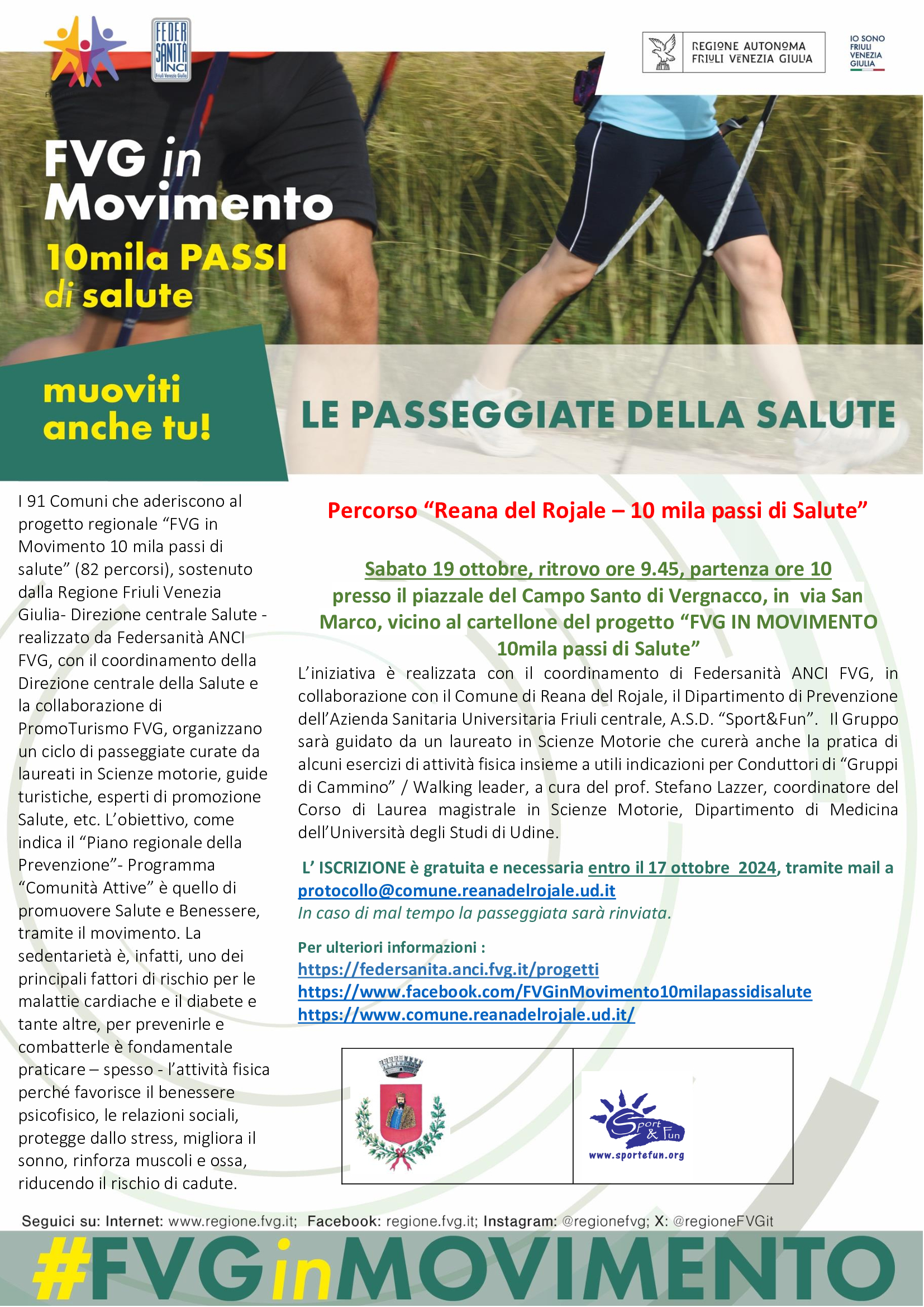 La partenza è prevista alle 10.La passeggiata è organizzata nell’ambito del progetto regionale “FVG IN MOVIMENTO.10mila passi di Salute”, sostenuto dalla Regione FVG - Direzione centrale Salute, attuato da Federsanità ANCI FVG, nell'ambito del “Piano regionale della prevenzione – Comunità attive”, in collaborazione con il Comune di Reana del Rojale, il Dipartimento di Prevenzione dell’Azienda Sanitaria Friuli Centrale, A.S.D. “Sport&Fun”, le Associazioni locali e i Gruppi di cammino. Il gruppo sarà guidato da un laureato in Scienze Motorie che curerà anche la pratica di alcuni esercizi di attività fisica insieme a utili indicazioni per Conduttori di “Gruppi di Cammino” / Walking leader, a cura del prof. Stefano Lazzer, coordinatore del Corso di Laurea magistrale in Scienze Motorie, Dipartimento Area Medica, Università di Udine.