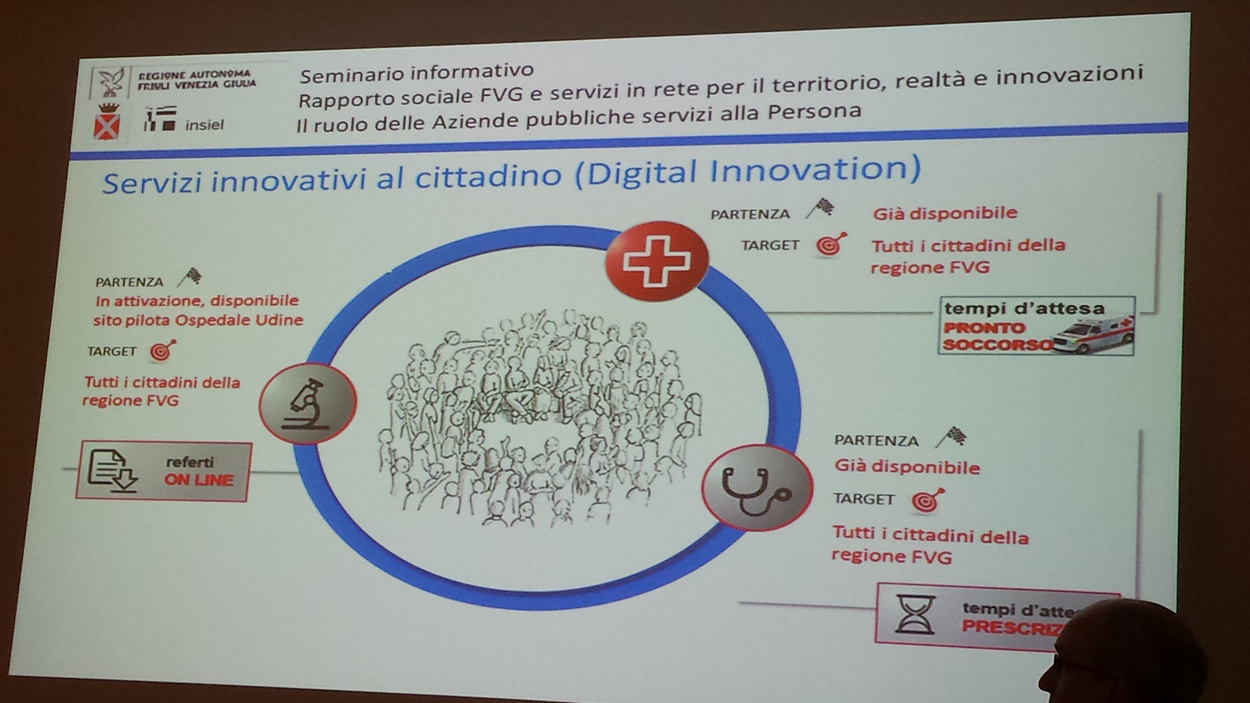 Una rete di connessioni strategiche per cui Federsanità insieme alla Regione e a INSIEL S.p.A. sta monitorando la situazione attuale a partire dalle esigenze delle persone anziane e disabili per progettare insieme servizi sempre più accessibili e fruibili, come hanno illustrato Gilberto Bragonzi, curatore progetto “Osservatorio ICT e Agenda Digitale sanitaria” di Federsanità ANCI FVG e Fulvio Sbroiavacca, direttore divisione sanità Insiel. Sull’esperienza quotidiana delle case di riposo e ASP e le “sinergie in rete” sono intervenuti puntualmente il neo presidente ASP “D. Moro” di Codroipo, Andrea D'Antoni, il direttore generale dell’ ASP “La Quiete di Udine”, Salvatore Guarneri e la presidente ASP “G. Chiabà” di San Giorgio di Nogaro, Daniela Corso.