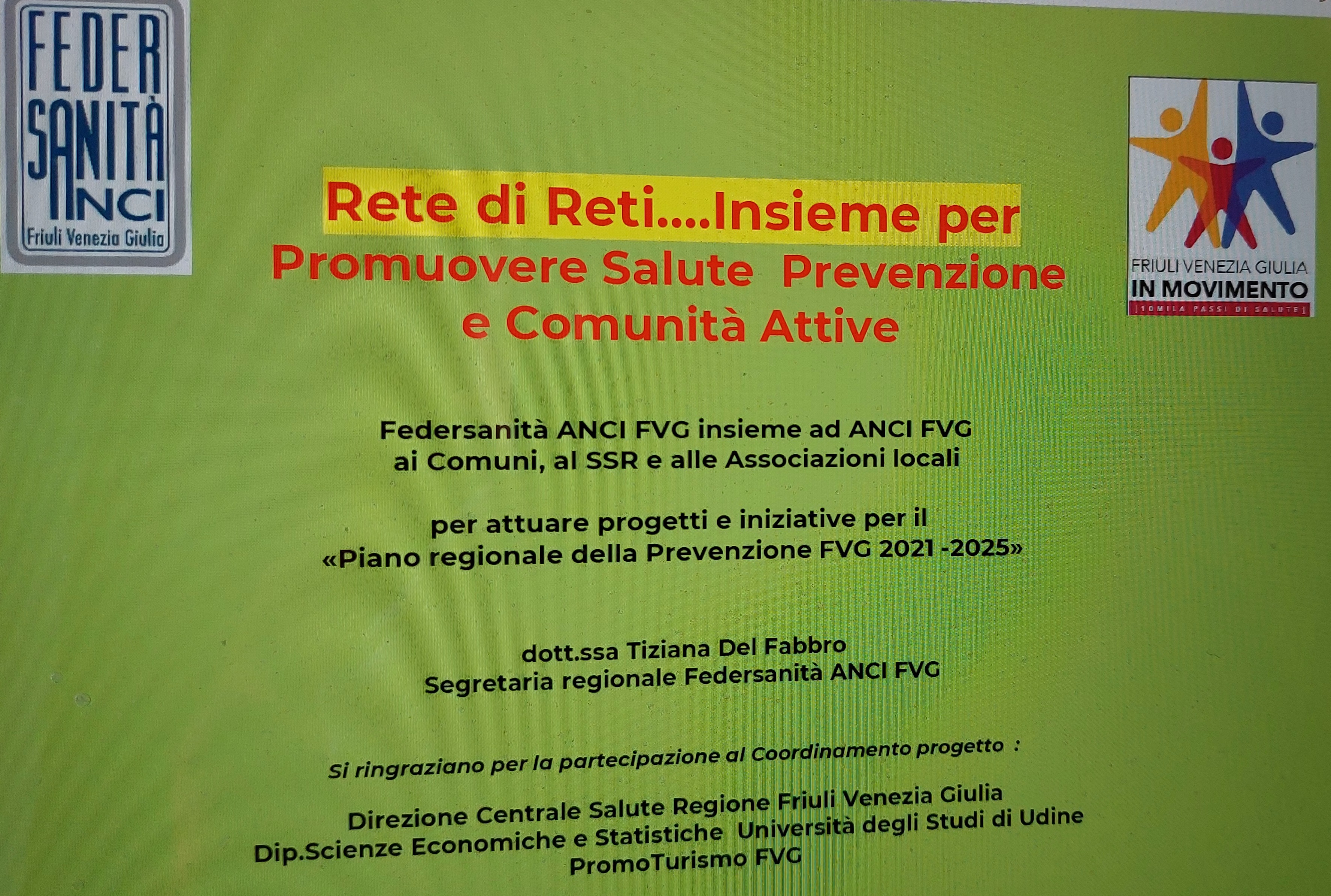 Nella sessione "Corpore sano in città sane", Tiziana Del Fabbro, segreteria regionale di Federsanità ANCI FVG, ha sintetizzato le attività e i principali risultati del progetto pluriennale e multisettoriale “FVG IN MOVIMENTO 10mila passi di Salute” https://federsanita.anci.fvg. it/progetti avviato con il sostegno della Regione Friuli Venezia Giulia, nel novembre 2018, coordinato da Federsanità ANCI FVG, in collaborazione con la Direzione centrale Salute, il Dipartimento di Scienze Economiche e Statistiche dell’Università degli Studi di Udine ( fase di valutazione) e PromoTurismo FVG.