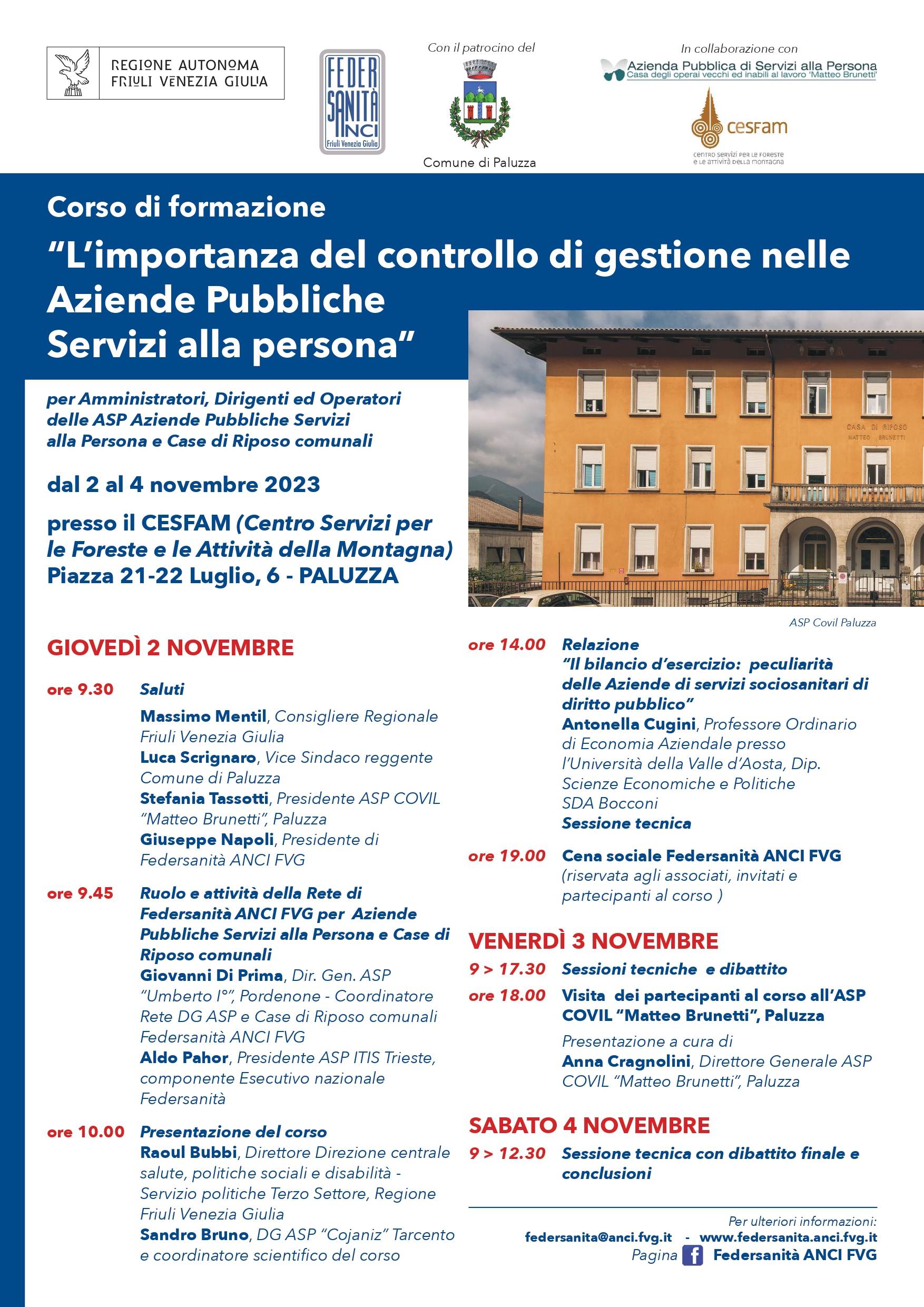 In apertura del corso sono intervenuti ; Massimo Mentil, Consigliere Regionale Friuli Venezia Giulia, Luca Scrignaro, Vice Sindaco reggente di Paluzza, Stefania Tassotti, Presidente ASP COVIL “Matteo Brunetti”, Paluzza, Giuseppe Napoli, Presidente di Federsanità ANCI FVG, Giovanni Di Prima, direttore di ASP “Umberto I^”, Pordenone, Coordinatore Rete DG ASP e Case di Riposo comunali Federsanità ANCI FVG e Aldo Pahor, Presidente ASP ITIS Trieste, componente Esecutivo nazionale Federsanità. Quindi, le relazioni di Raoul Bubbi, Direttore Direzione centrale salute, politiche sociali e disabilità Servizio politiche Terzo Settore della Regione e Sandro Bruno, curatore scientifico del corso.