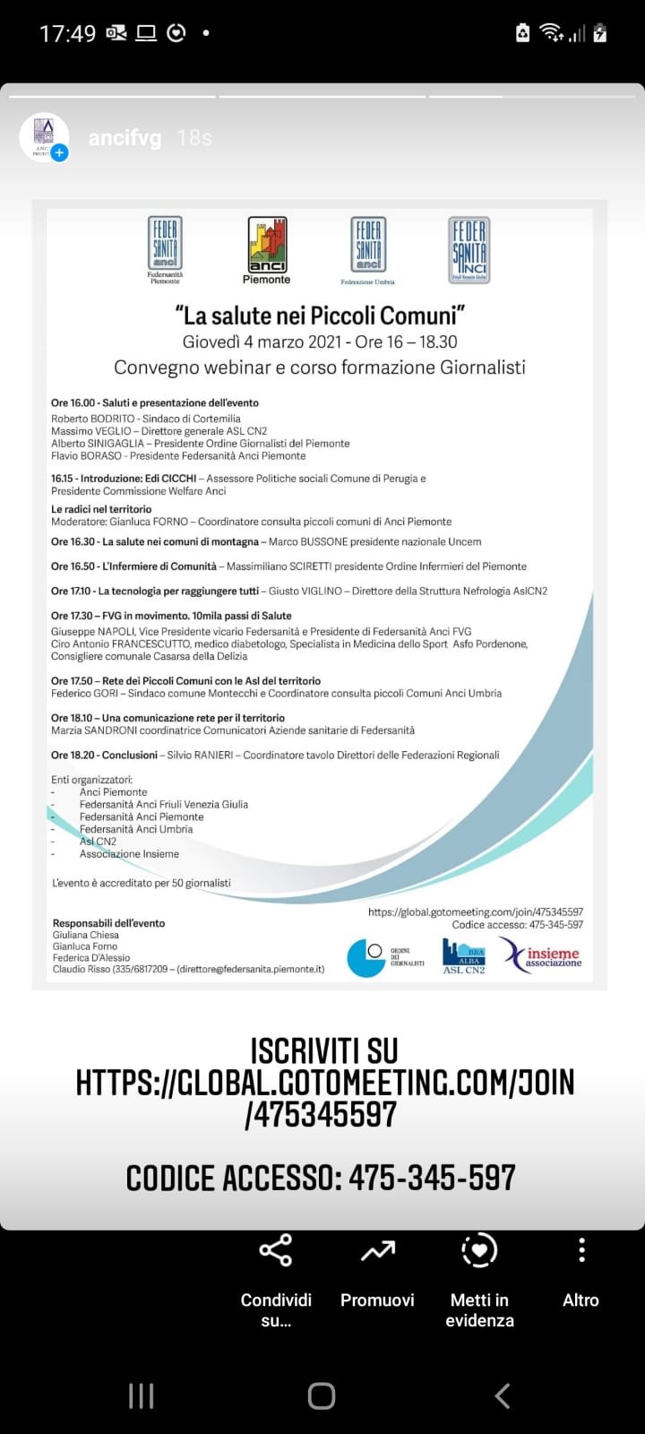 Federsanità ANCI FVG partecipa alla organizzazione del webinar "La Salute nei piccoli Comuni", promosso da Federsanità ANCI Piemonte e ANCI Piemonte, insieme alla Federazione dell'Umbria e alla nostra. Si tratta di un appuntamento importante per conoscere progetti e "buone pratiche" di altre Regioni su questi temi.