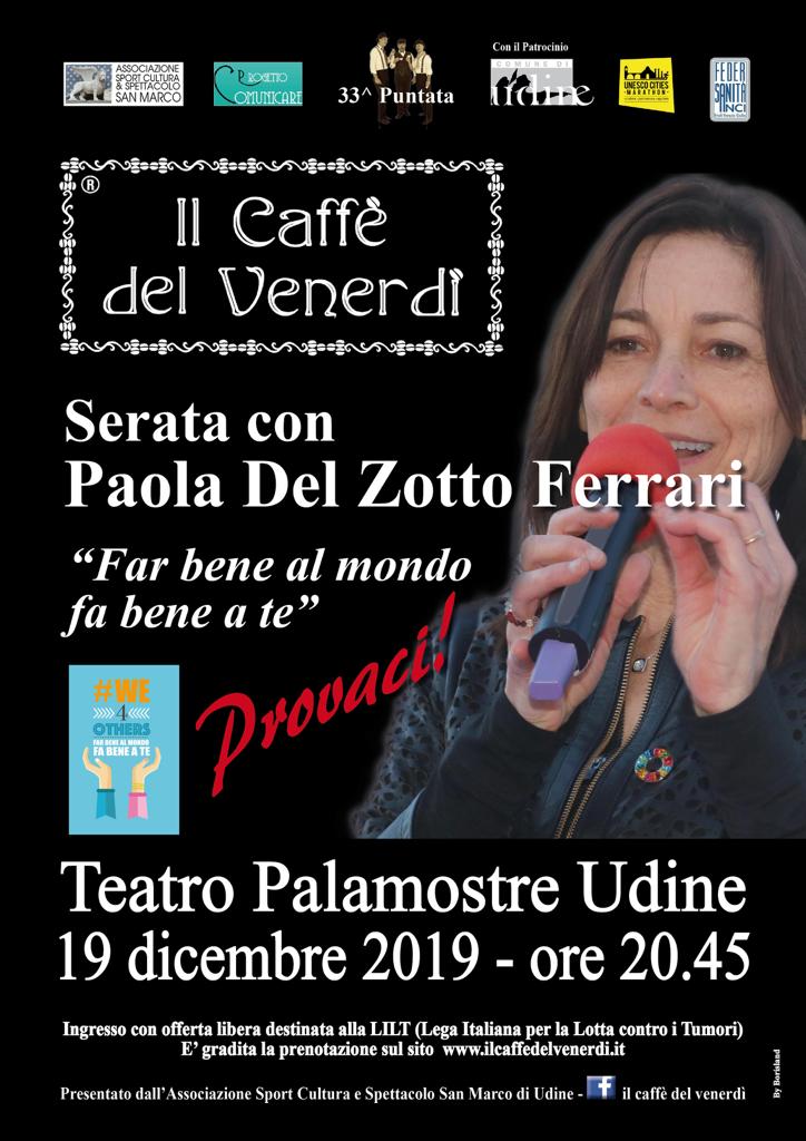 Stasera alle 20.45, al teatro Palamostre di Udine, "Il Caffè del Venerdì" organizza la serata di solidarietà "Far bene al mondo fa bene a te: Provaci!”, con Paola Del Zotto Ferrari, esperta di no profit, moglie dell'insigne scienziato Mauro Ferrari (da 1 gennaio 2020 Presidente del Consiglio Europeo della ricerca).