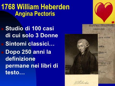 Quali sono i punti rilevanti che segnano le differenze uomo-donna? Molti e tutti interessanti. Basterebbe riflettere su alcuni dati di cardiologia: quando nel 1768 William Heberden pubblicò il suo studio di 100 casi (di cui solo 3 donne...) sui sintomi dell'angina pectoris, riportò il "classico" dolore restrosternale, spesso irradiato al braccio sinistro. A livello clinico esiste invece una differenza sostanziale nei due sessi, in quanto nella donna il dolore da angina o da infarto cardiaco (IMA) si può frequentemente manifestare in maniera diversa. Uno studio ampio (WISE et al.) ha infatti confermato che nella donna i sintomi precoci sono prevalentemente atipici: il dolore è spesso irradiato alle spalle, al dorso e al collo, si associa a qualche difficoltà di respirazione, spesso a nausea persistente, vomito, sudorazione fredda, spossatezza. Sembrano quasi dei sintomi influenzali. Si tratta con chiara evidenza di manifestazioni "diverse" da quelle che generazioni di medici hanno imparato e praticato: tuttavia, dopo 250 anni, la definizione classica permane nei libri di testo e le conseguenze sono palpabili: in assenza di sintomi classici, infatti, la donna con un episodio ischemico cardiaco in atto, subisce un iter diagnostico e terapeutico diverso, che può comprendere delle false strade diagnostiche (accertamenti gastroenterici o comunque su patologie differenti da quella cardiaca) con conseguente perdita di tempo prezioso, magari attraverso un ricovero ma NON in terapia intensiva coronarica dove potrebbe essere sottoposta tempestivamente alle cure del caso, mediche invasive (applicazione di stent coronarici) o intervento cardiochirurgico.