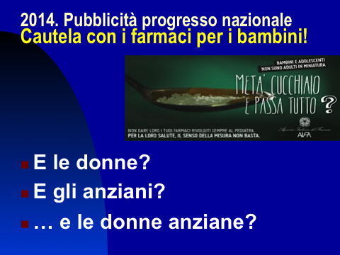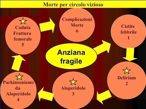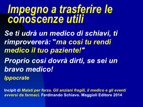 pubblicit progressoAscolto per radio la pubblicità progresso che fa il nostro ministero della salute a proposito di bambini, adolescenti e farmaci: bambini e adolescenti non sono adulti in miniatura. Metà cucchiaio e passa tutto? Corretta e utile, è innegabile! Ma perché non regalare le stesse attenzioni e precauzioni per i vecchi, e soprattutto le vecchie? Dovremmo osservare che nascono più vecchi che bambini! Ma c'è una politica e una medicina disattenta al problema anziani, la neurologia non è una branca ben conosciuta forse perché sottostimata nella sua importanza, la gerontologia sta seguendo la stessa sorte, così almeno a me pare. E' possibile immaginare che in un momento come l'attuale di crisi economica possano ricadere sul nostro welfare ulteriori "assenze di impegno" che ricadranno certamente sui più deboli. Formando, informando, sostenendo una cultura medica sarà possibile che quella parte di medicina frettolosa e distratta possa essere aiutata, o persino controllata, dalle figure professionali dei "non medici" e persino dai pazienti e dai cittadini che abbiano voglia di mettersi in gioco e apprendere. L'ho chiamata da Tolomeo a Copernico questa rivoluzione che mette il cittadino o il paziente o il qualificato "non- medico" al centro del nostro sistema.