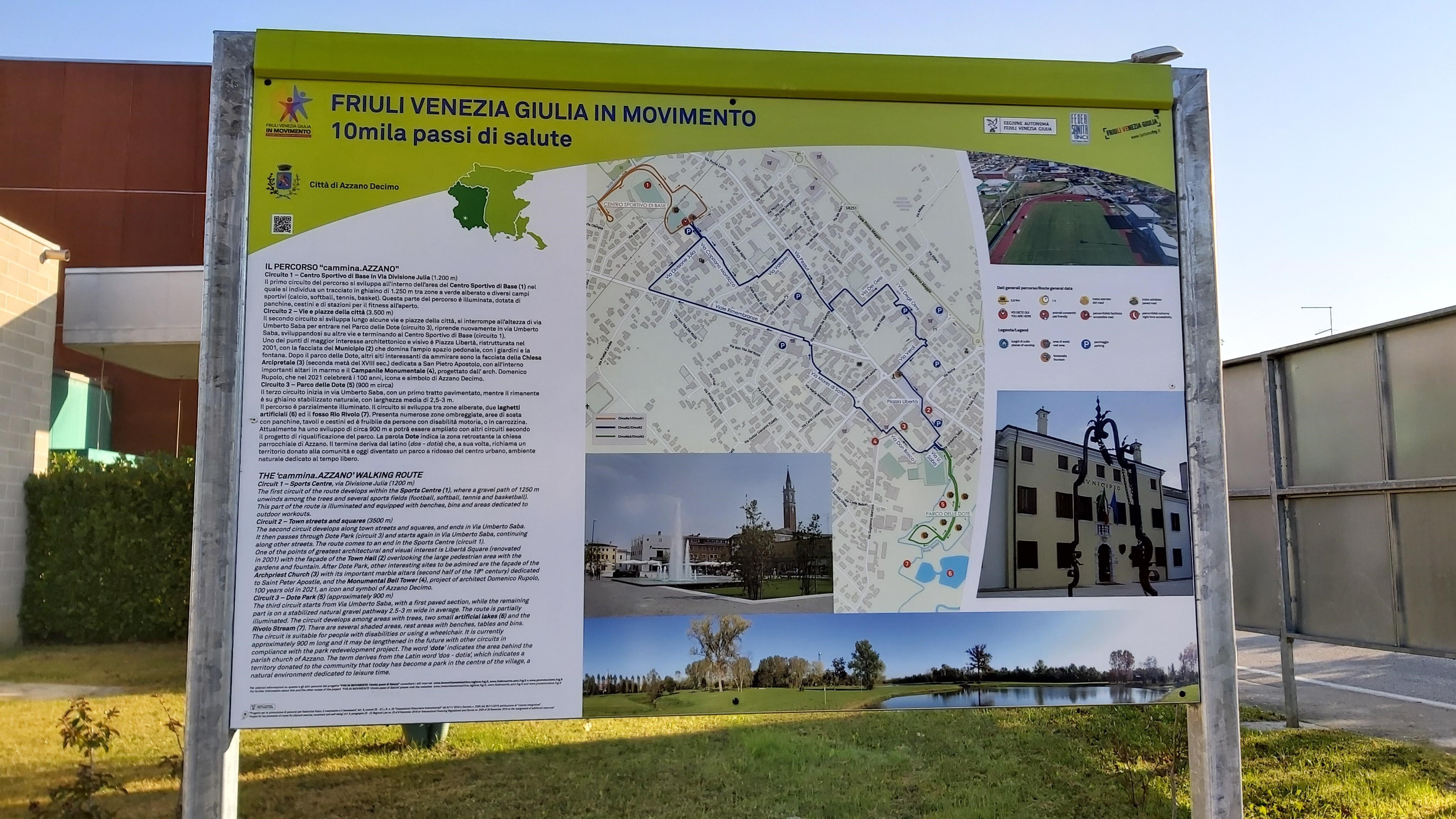 Il percorso "cammina.AZZANO" è lungo complessivamente 5.6 chilometri e suddivio in tre circuiti collegati tra loro: il primo, di 1.200 metri, si sviluppa all'interno del centro sportivo di base di via Divisione Julia; il secondo, ampio 3.500 metri, attraverso le vie e piazze di Azzano Decimo, il terzo circuito, di 900 metri, nel Parco della Dote, l'area verde più importante della cittadina. E' seguita la passeggiata dimostrativa per la prima parte del percorso.
