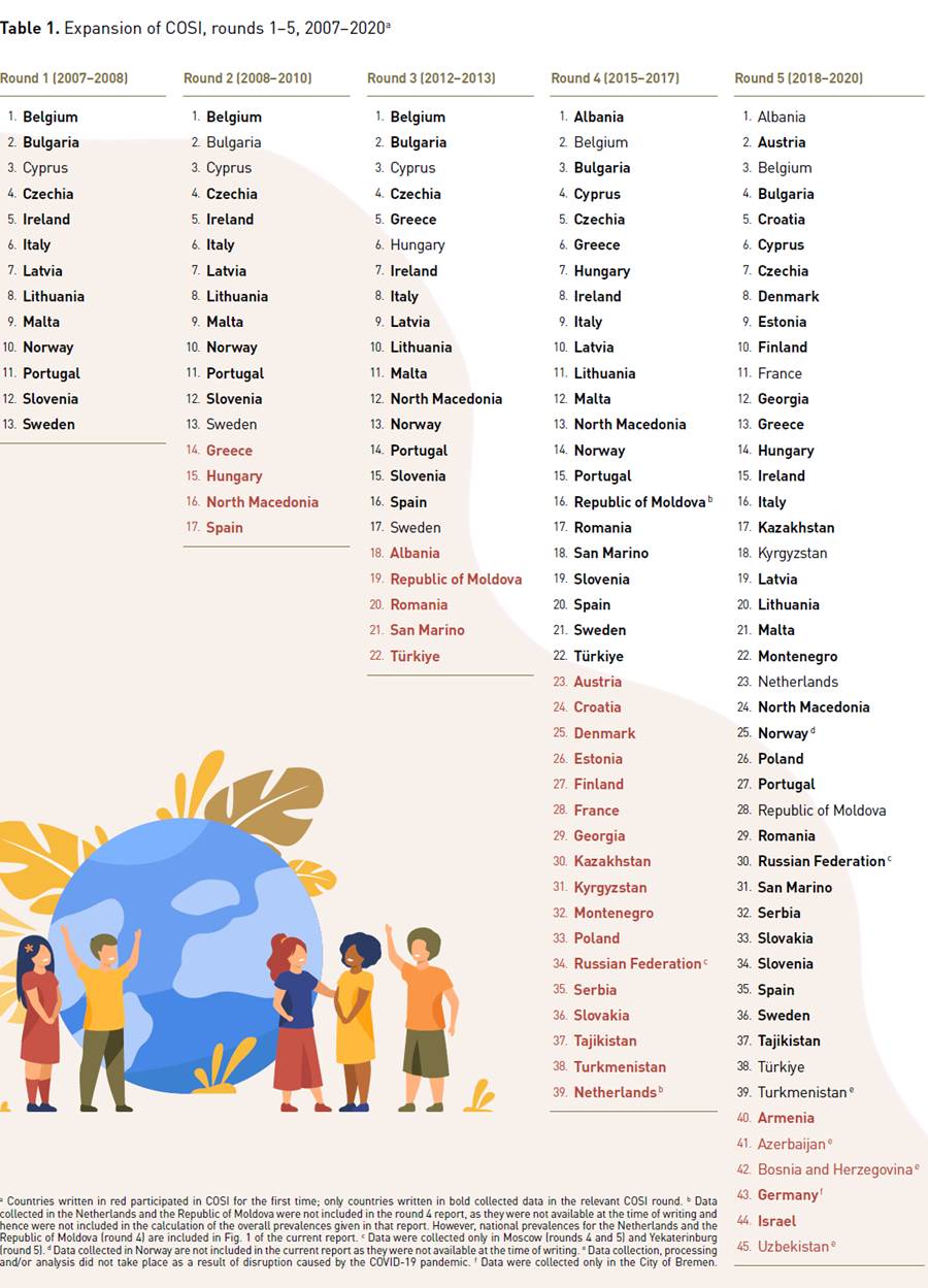 I risultati del nuovo rapporto si basano in particolare sugli ultimi dati raccolti nel 2018-2020 in 33 paesi della regione europea dell'OMS. In totale, sono stati monitorati quasi 411.000 bambini di età compresa tra 6 e 9 anni. Per la prima volta, il rapporto presenta i dati di Armenia, Germania (città di Brema) e Israele, paesi che hanno recentemente aderito all'iniziativa di sorveglianza dell'OMS.