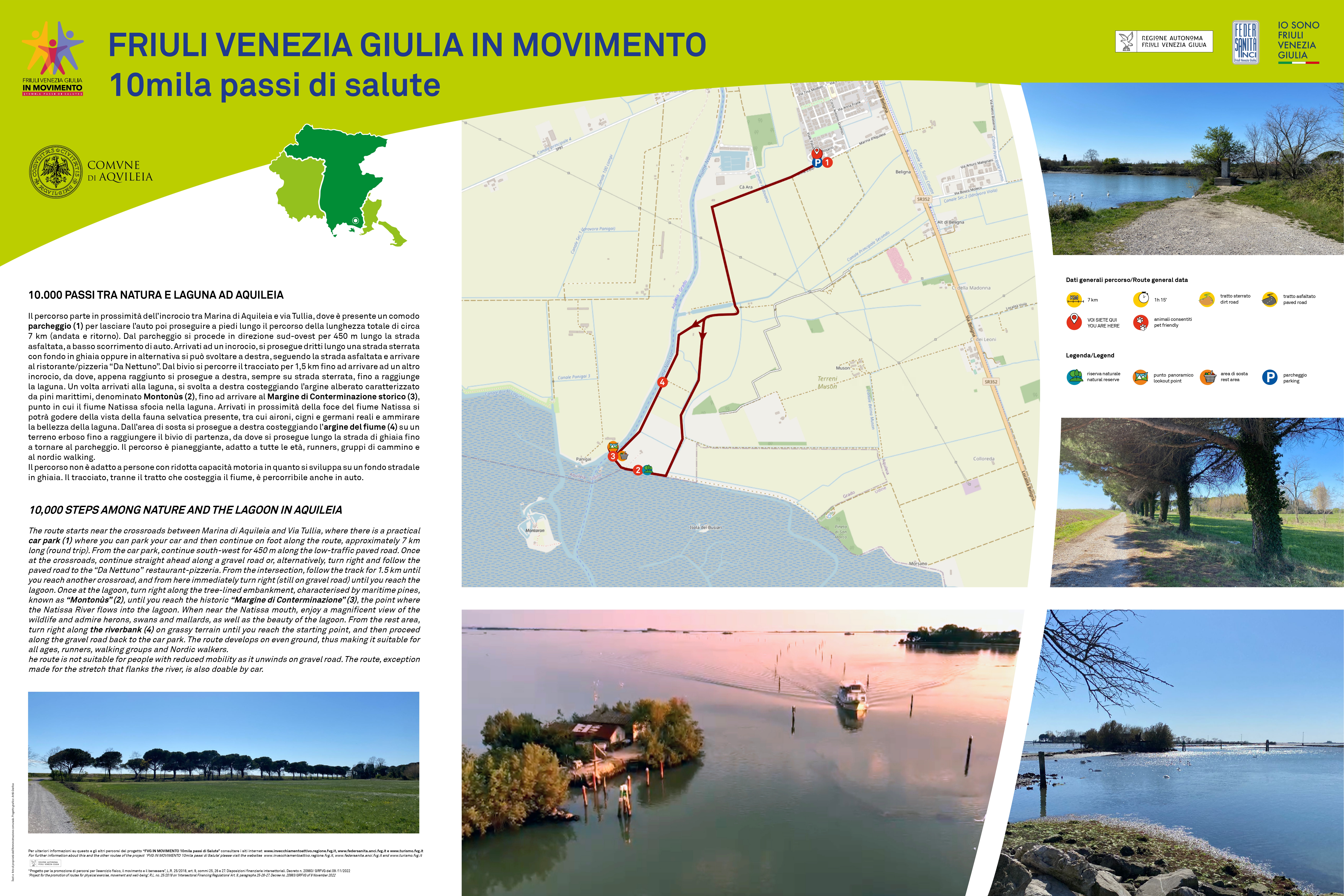 “10milapassidisalute tra natura e laguna ad Aquileia” è un percorso splendido e unico, ricco di luce e profumi, tra il verde della rigogliosa campagna della Bassa friulana e tutte le sfumature dell'azzurro, dalla laguna, con i cigni, al fiume Natissa, con la Marina d’Aquileia, al cielo, fino alle bianche cime delle montagne innevate, con i vicini campanile della Basilica e le suggestive testimonianze della storia, cultura ed arte di una capitale storica del Friuli, a pochi passi dalla nota località balneare di Grado.