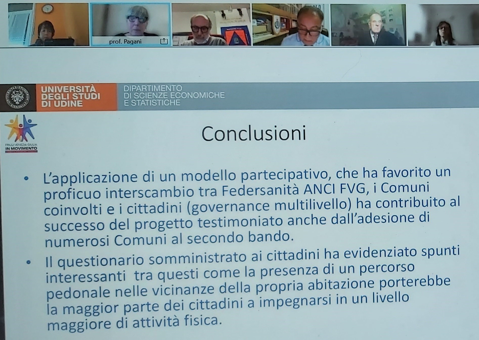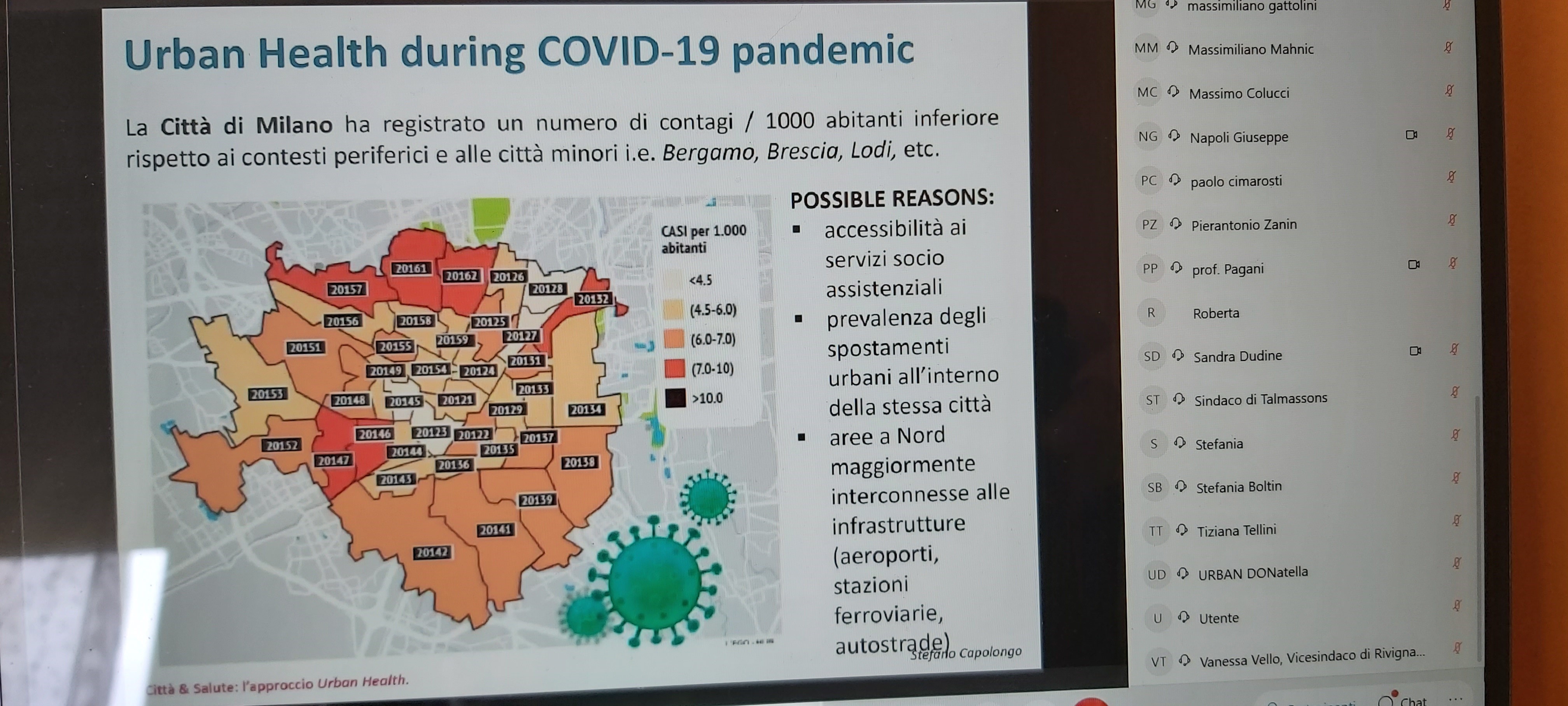 Il concetto di “Urban Health” https://www.who.int/health-topics/urban-health sviluppato negli anni recenti, identifica tutte le pratiche e le azioni orientate alla tutela e alla promozione della salute in ambiente urbano, in ambienti chiusi e all’aperto. In precedenza, dopo l'intervento del Presidente di Federsanità ANCI FVG, Giuseppe Napoli, sono intervenuti:il prof. Stefano Capolongo, Direttore Dipartimento di Architettura, Ingegneria delle costruzioni e Ambiente costruito del Politecnico di Milano, Ciro Antonio Francescutto, diabetologo e medico dello sport, ASFO, Tiziana Del Fabbro, Segretaria regionale di Federsanità ANCI FVG Laura Pagani del Dipartimento di Scienze Economiche e Statistiche dell'Università di Udine.