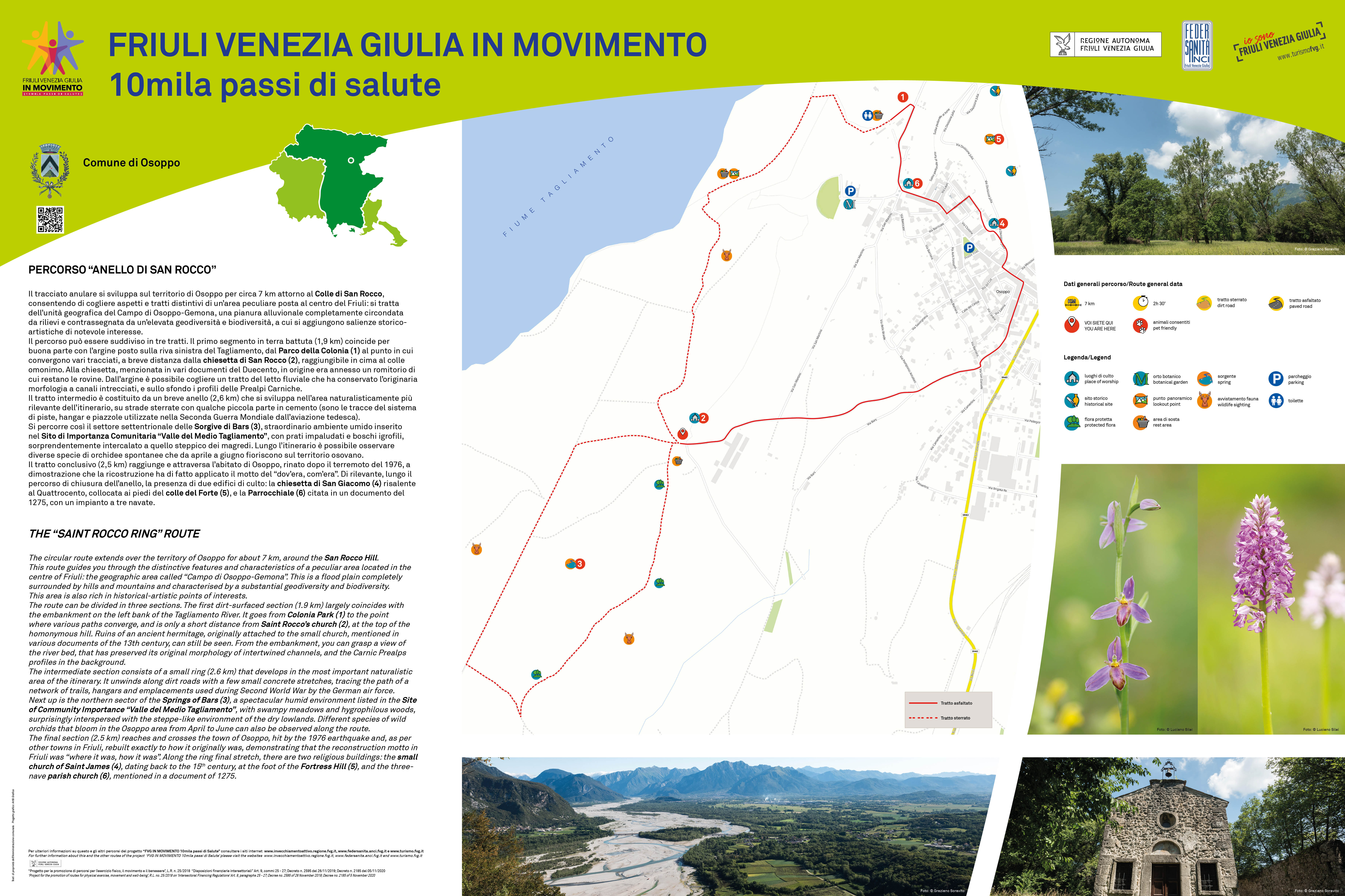 Lo ha affermato oggi il vicegovernatore con delega alla Salute del Friuli Venezia Giulia Riccardo Riccardi, intervenendo alla presentazione dell'adesione da parte del Comune di Osoppo al progetto 'Fvg in movimento. 10mila passi di salute', promosso dalla Regione e realizzato da Federsanità Anci Fvg in collaborazione con la Direzione centrale Salute, il Dipartimento di Scienze economiche e statistiche dell'Università di Udine e PromoTurismoFVG.L'"Anello di San Rocco", inaugurato oggi nel parco ex colonia elioterapica di Osoppo, è uno dei 59 percorsi - dai monti al mare, in tutta la regione consultabili online al link https://federsanita.anci.fvg.it/progetti - a cui hanno aderito 70 Comuni, tramite la partecipazione a due bandi del 2019 e del 2021. L'anello di Osoppo si sviluppa per circa sette chilometri attorno al colle di San Rocco, permettendo di conoscere aspetti storici e naturalistici di un'area unica al centro del Friuli, l'unità geografica del Campo di Osoppo-Gemona, ovvero una pianura alluvionale circondata completamente da rilievi e contrassegnata da elevata geo e biodiversità.