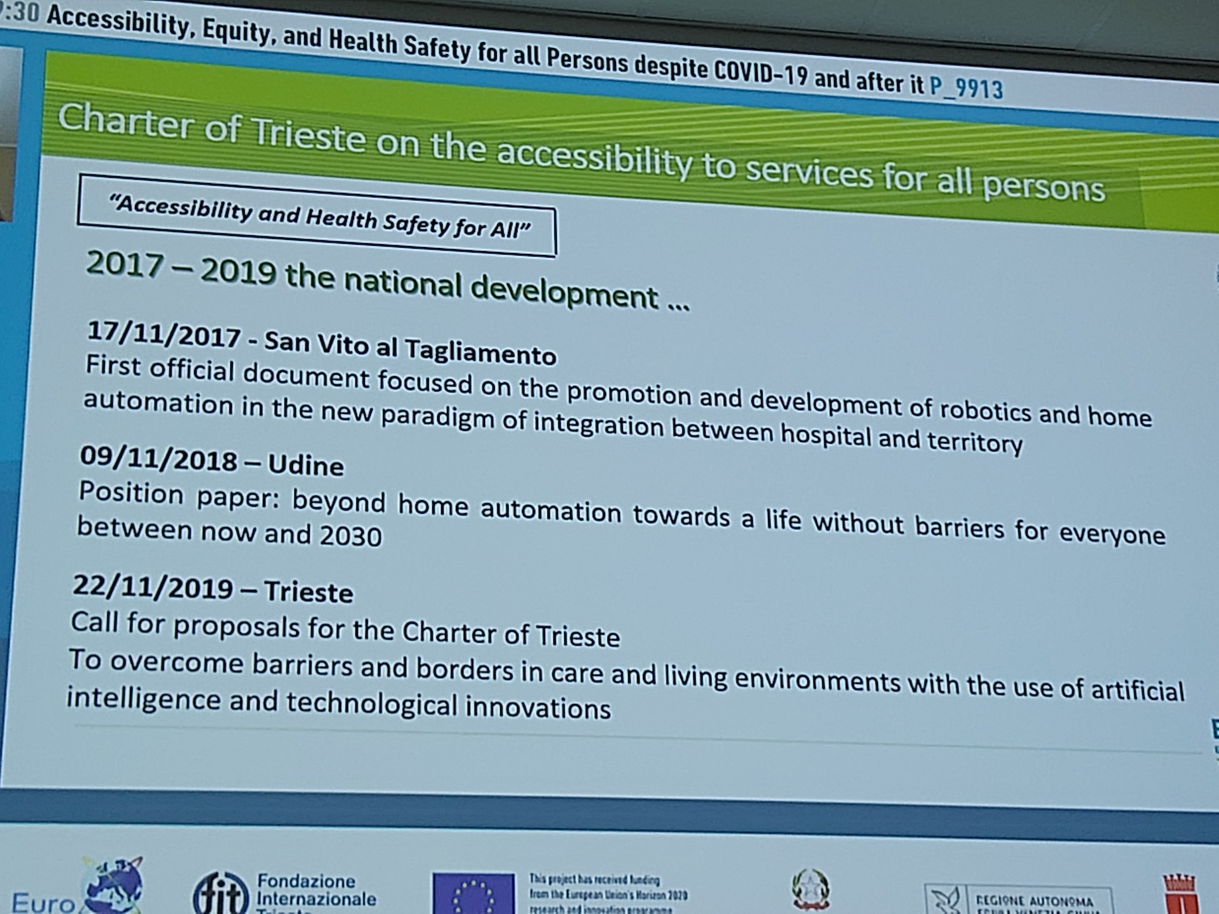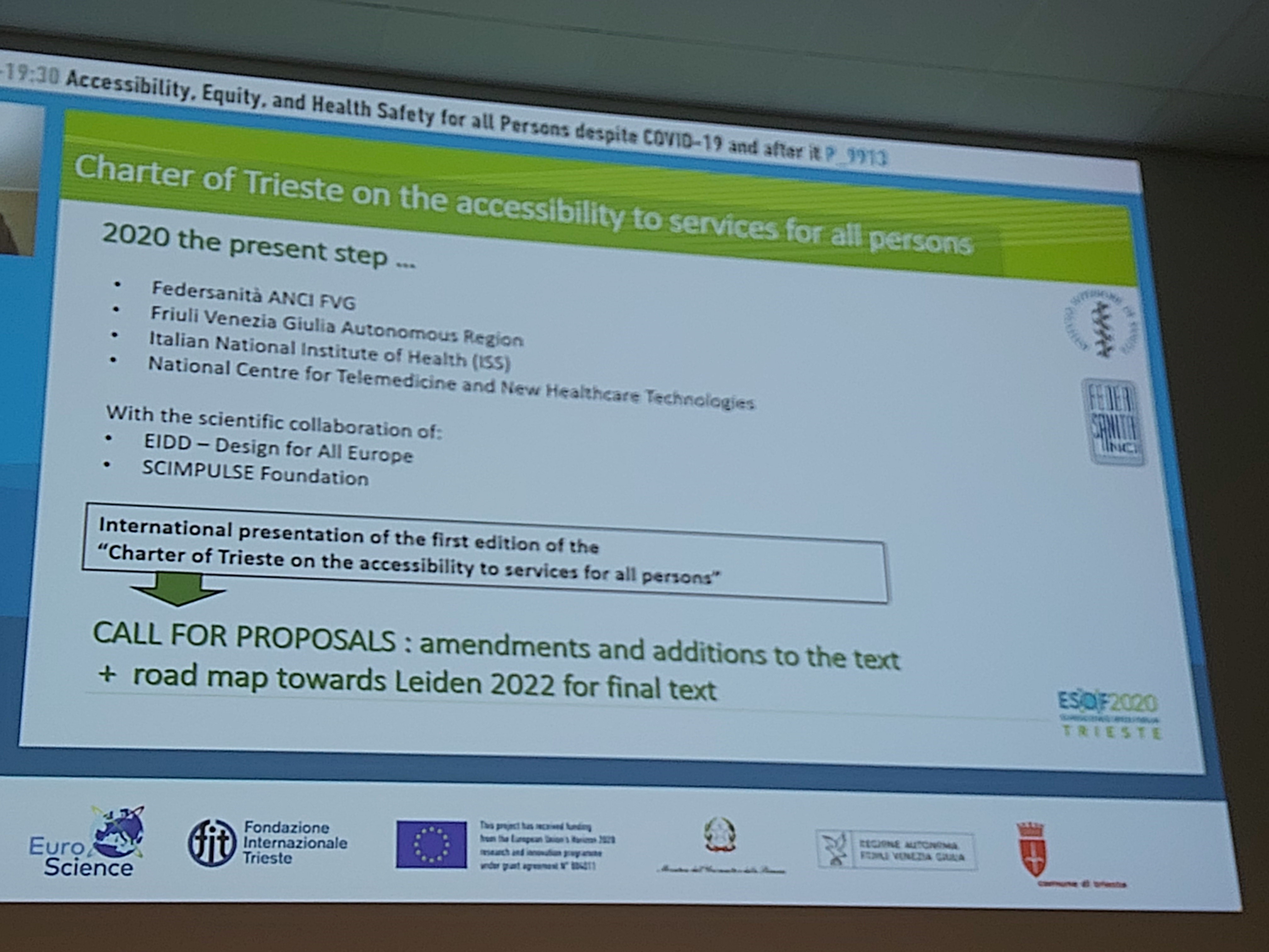Superare le barriere che ostacolano l'accesso ai servizi e il godimento dei diritti delle persone, compresa la mobilità e l'autonomia delle persone con disabilità, e di fare il miglior uso delle tecnologie digitali nella vita quotidiana così come in quella scientifica. E' l'obiettivo della "Carta di Trieste sull'accessibilità ai servizi per tutte le persone", promossa da Federsanità Anci Fvg e "Centro Nazionale Telemedicina e Nuove Tecnologie Sanitarie Istituto Superiore di Sanità Italiano" insieme a "EIDD - Design for All Europe "e" Fondazione SCIMPULSE ", presentata nell'ambito di Esof.