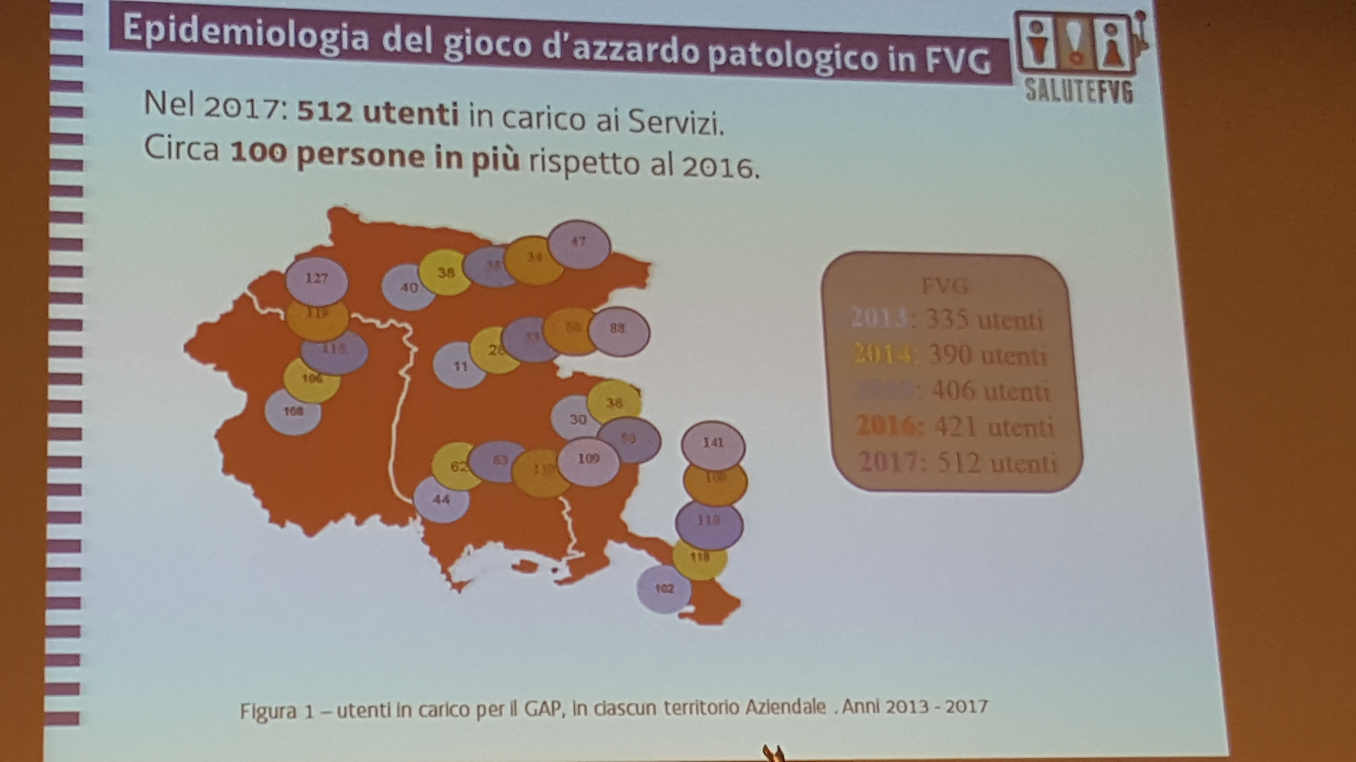 Secondo i dati dell'Agenzia delle dogane e dei monopoli in Friuli Venezia Giulia le slotmachine elettroniche installate sono 9.107 distribuite in 1.990 esercizi pubblici, i Vlt sono 1.008 diffusi in 86 sale, ai quali si sommano altri 1.863 apparecchi per scommesse e il volume medio di gioco pro capite nel 2016 è stato di 1.343 euro (se si considerano solo i maggiorenni). In questo quadro si stima che le persone con problemi di gioco d'azzardo siano circa 6.000, con pesanti ricadute a livello familiare e sociale che si riflettono sulla sfera comunitaria fino a rientrare nelle problematiche della salute pubblica. A dare la dimensione della crescita del fenomeno negli ultimi anni è soprattutto il numero degli accessi al Servizio dipendenze comportamentali che è passato da 335 nel 2013 a 502 nel 2017, 218 dei quali nuovi utenti. Si tratta prevalentemente di uomini (77%), che mediamente hanno accumulato circa 100mila euro di debiti e che spesso hanno anche problemi legali.
