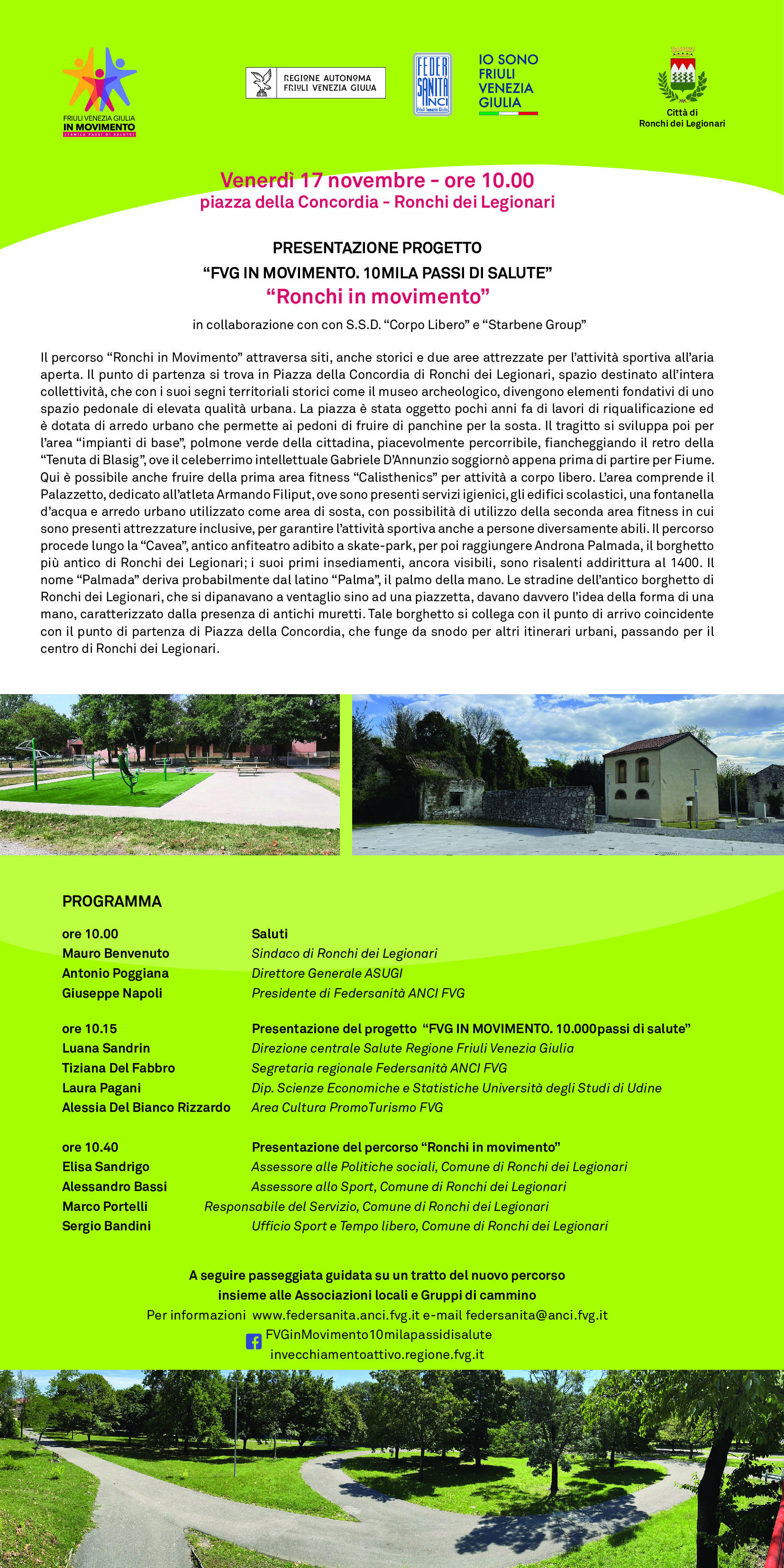 Venerdì 17 novembre, alle ore 10:00 a Ronchi Dei Legionari, in piazza della Concordia, si terrà la presentazione del nuovo percorso "10mila passi di salute" "Ronchi in movimento" in collaborazione con il Comune di Ronchi dei Legionari e S.S.D "Corpo Libero" e "Starbene Group".