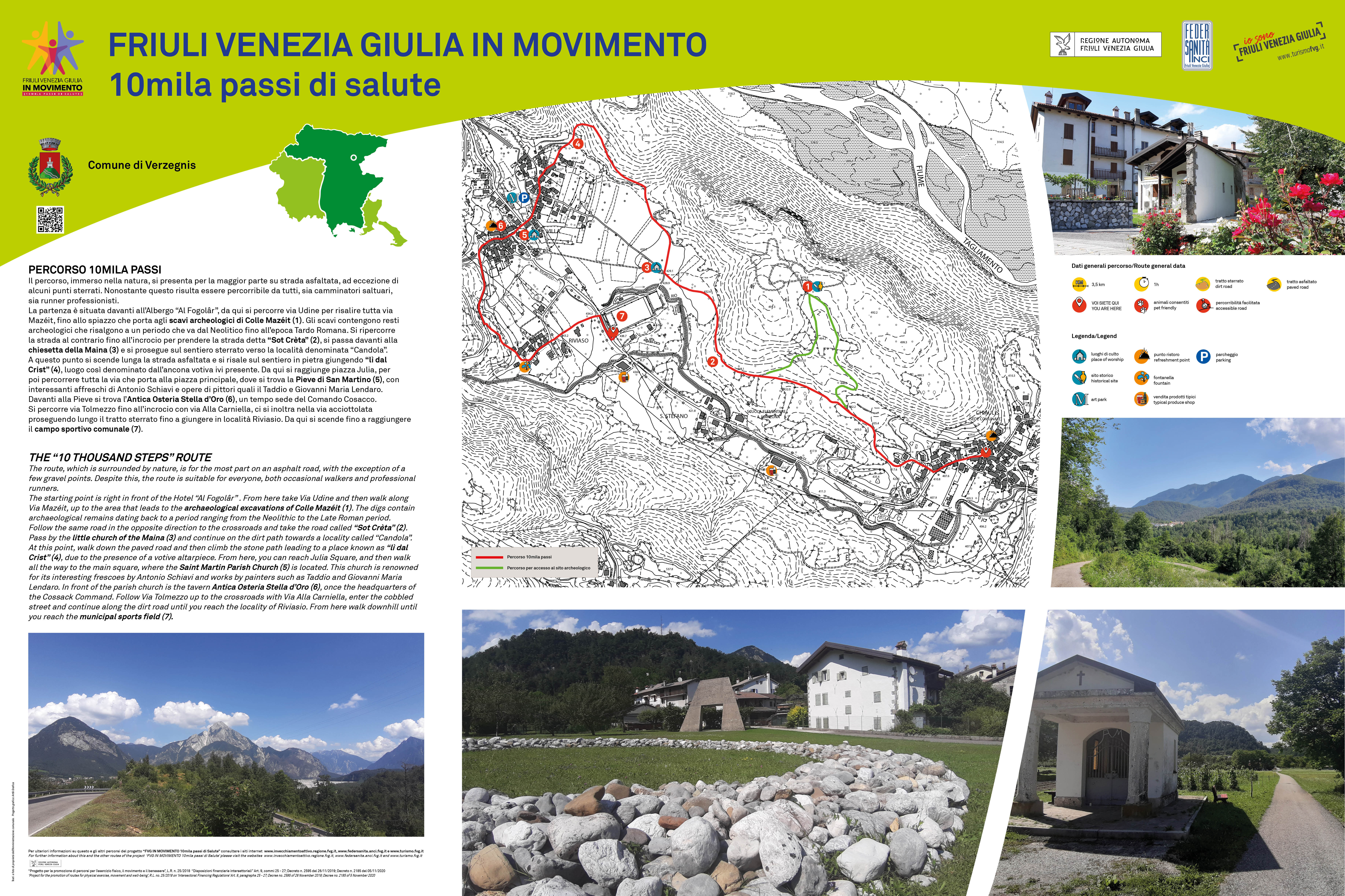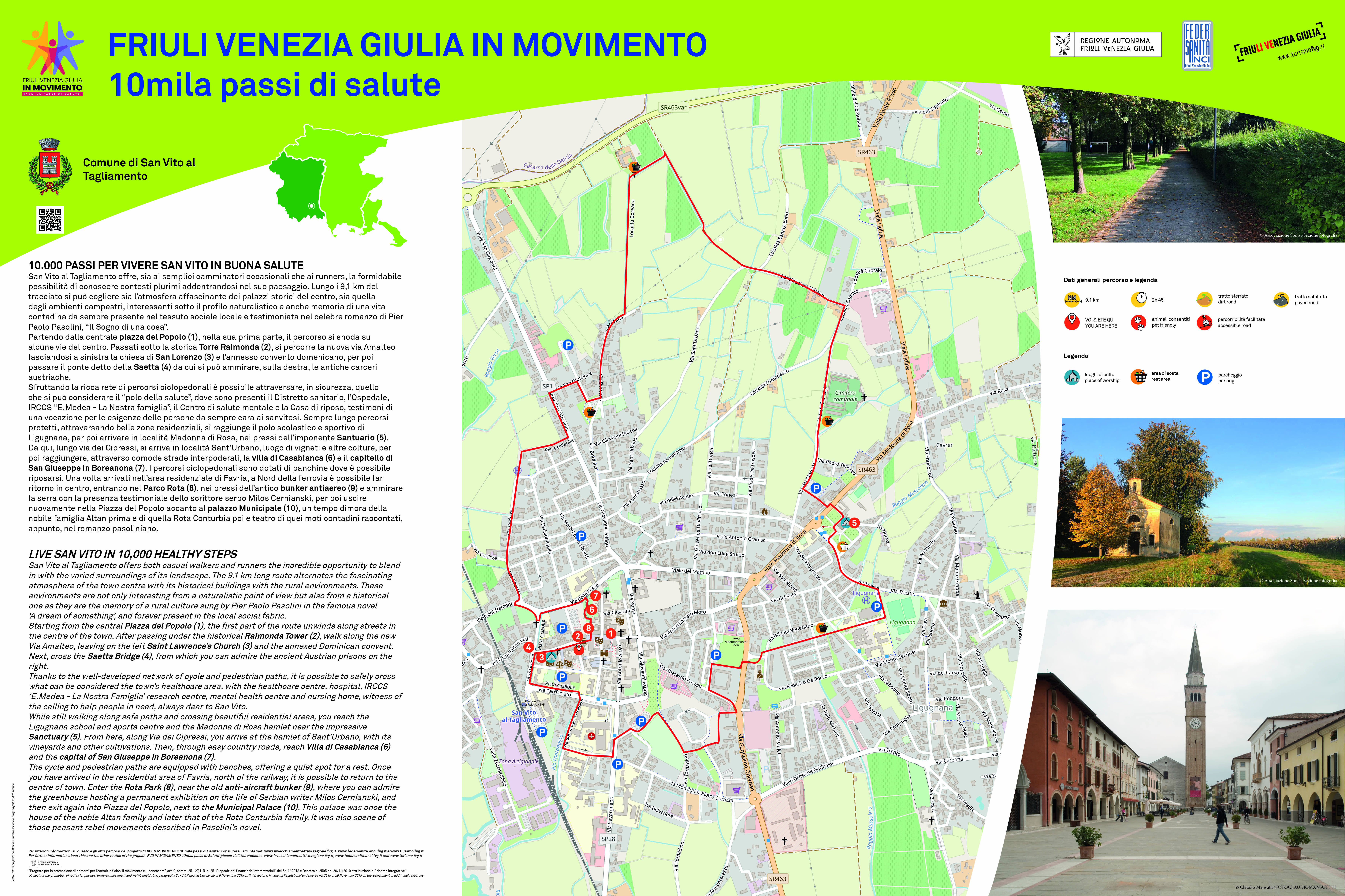 In breve, 10.000mila passi di Salute, è l’attività motoria media quotidiana raccomandata dagli esperti di Salute (OMS), certo, non tutti riescono a praticarla quotidianamente, ma almeno come impegno/obiettivo è una “buona abitudine” che fa bene alla salute fisica e al benessere generale, anche psicologico, delle persone e aiuta a prevenire molte malattie cardiologiche, polmonari, sovrappeso e obesità, diabete, etc. Di recente “European Journal of Preventive Cardiology” ha pubblicato un’ampia analisi condotta su 36mila persone, che mostra come “anche sotto i 10mila passi quotidiani, aumentare l’attività fisica riduca sensibilmente il rischio di infarto, ictus e scompenso. Effetto amplificato con maggiore intensità di cammino". Oggi, poi, con i moderni device (cellulari e orologi) tutti possiamo facilmente monitorare i m./passi che ogni giorno facciamo. Si tratta di un’attività facile e accessibile per tutti, da praticare all’aperto, ovunque e in grande libertà di orari e luoghi, ancor più piacevole nella bella stagione, ma non solo. Proprio con questo spirito è nato il progetto “FVG in Movimento.10mila passi di Salute”, finanziato dalla Regione Friuli Venezia Giulia, nel dicembre 2018 (L.R. 25/2018 art. 9 co. 25-27), che si inserisce nella più ampia programmazione integrata e coordinata delle attività di promozione della salute prevista nei Piani nazionali e regionali della Prevenzione, il più recente 2021-2025.